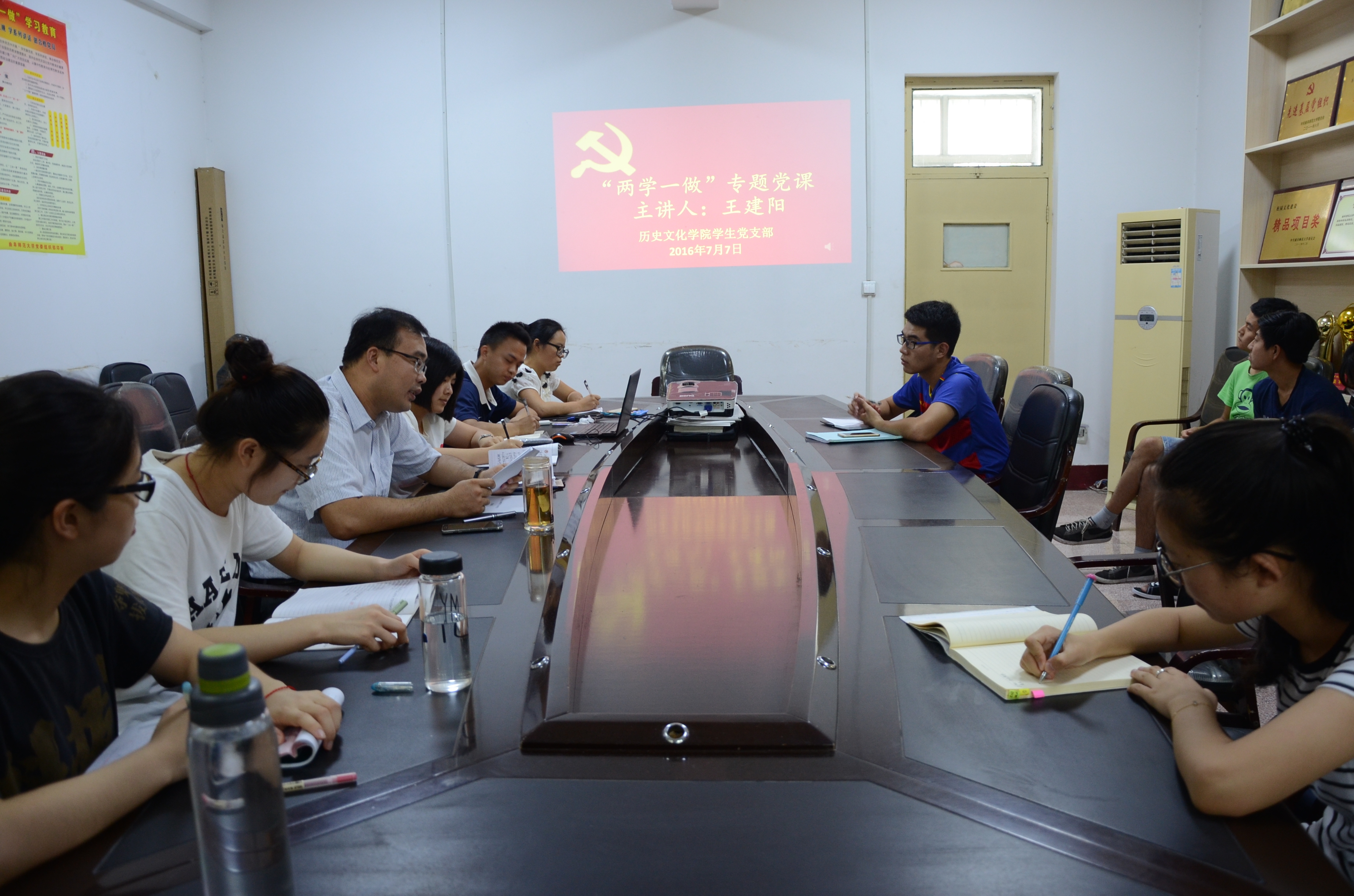 7月7日下午,成人短视频 学生党支部在文史楼二楼会议室召开全体党员会议,集中学习习近平总书记在庆祝建党九十五周年大会上的重要讲话,并听取了党支部书记王建阳同志的专题党课。