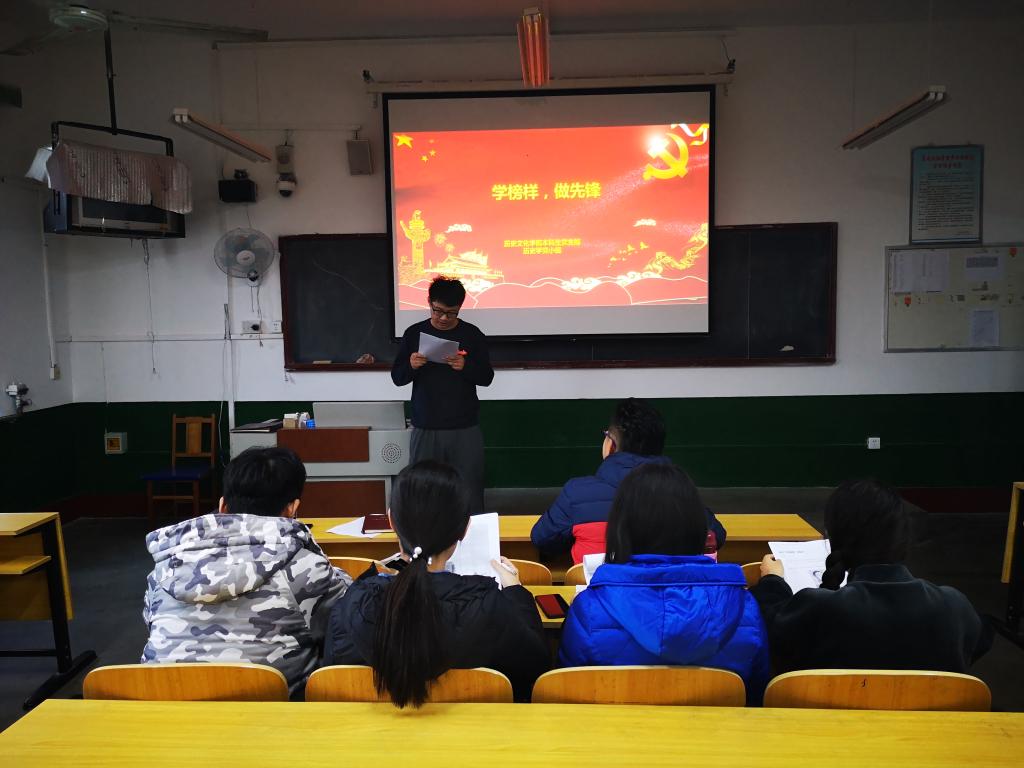 11月14日,本科生党支部全体党员在文史楼520教室集体观看《榜样3》专题节目,党支部王建阳书记号召大家学习先进典型、发挥榜样模范作用。