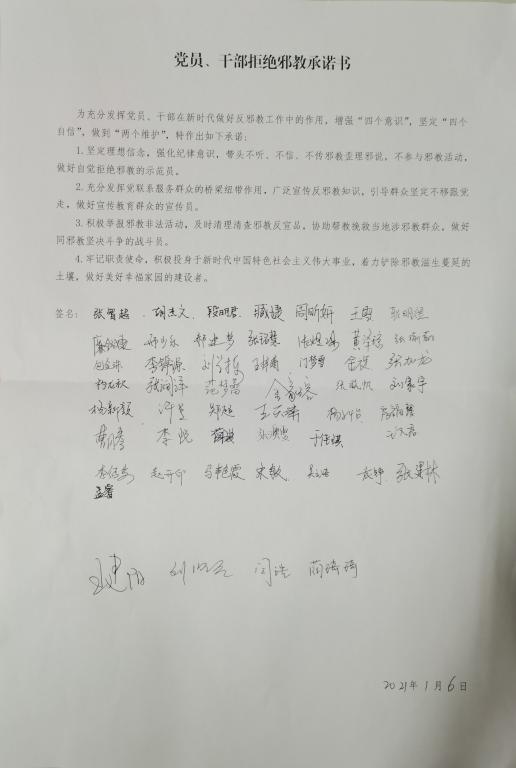 孟睿同志从邪教组织的定义、邪教的本质、邪教的危害等方面向党员同志进行了拒绝邪教教育,并向大家普及了抵制和防范邪教的方法。最后,在孟睿同志的带领下,全体党员做出拒绝邪教的承诺,坚决与邪教活动进行斗争,并发挥党员干部在新时代做好反邪教工作中的作用,增强“四个意识”、坚定“四个自信”、做到“两个维护”。