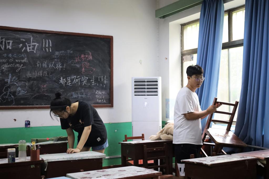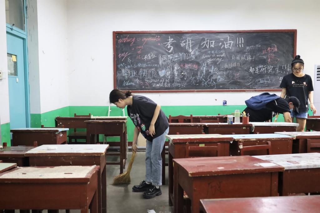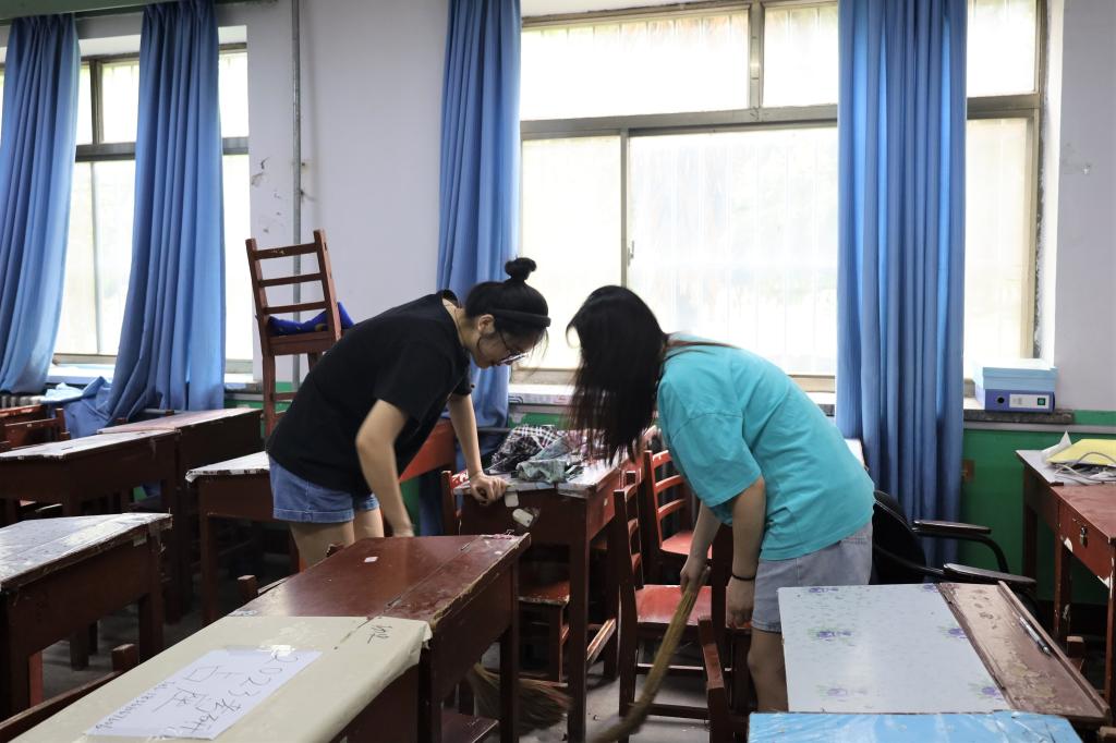 毕业生党员同志们分别在系楼103和106自习室集合,任务分配完毕后,分发卫生工具。擦门窗、扫地、拖地,大家干劲十足,尽情展现“史院先锋”的模范带头作用。