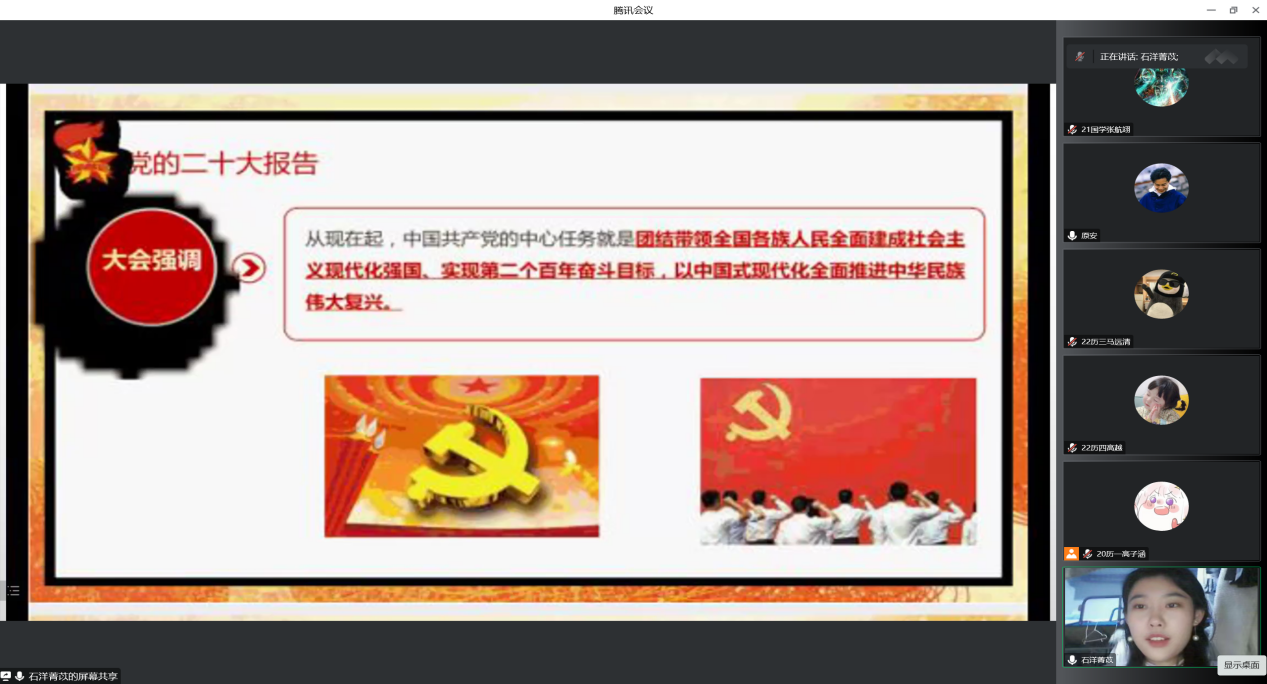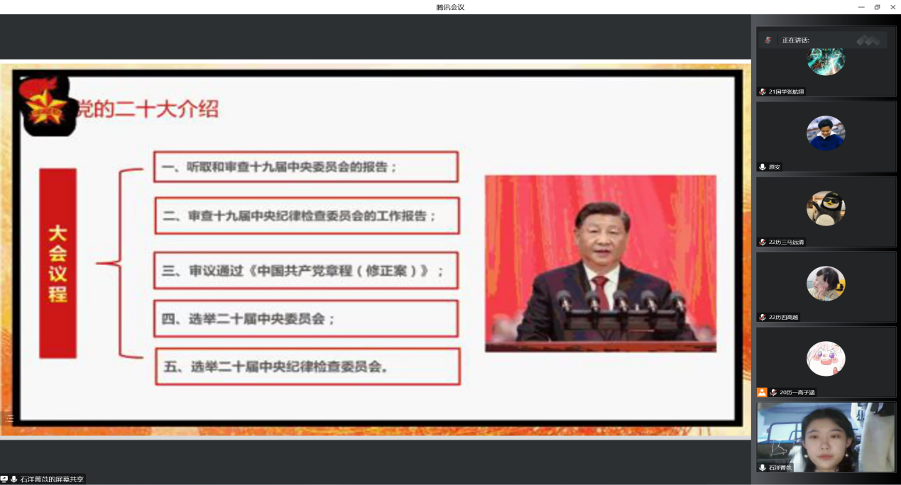 本次活动由成人短视频 2019级石洋菁苡同学主讲,以“深入贯彻党的二十大精神,在学懂弄通做实上下真功夫”为活动主题,主要围绕党的二十大介绍、党的二十大报告学习、二十大报告中总书记对青少年寄语和永远跟党走,奋进新征程等方面为党支部全体成员进行宣讲。活动最后,石洋菁苡同学建议全体在场成员做好学习计划调整心态,勇于争取,珍惜学习时光,不断丰富提高自己。