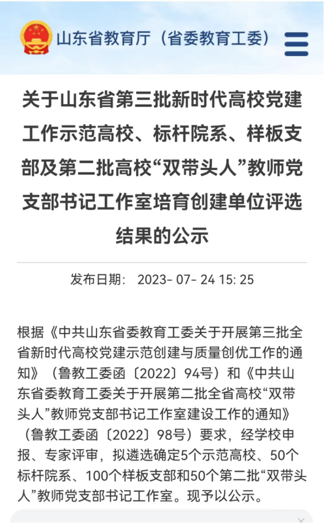 近日,山东省教育厅公布关于山东省第三批新时代高校党建工作示范高校、标杆院系、样板支部及第二批高校“双带头人”教师党支部书记工作室培育创建单位评选结果,共确定5个示范高校、50个标杆院系、100个样板支部和50个第二批“双带头人”教师党支部书记工作室。成人短视频 中国史教工党支部获评山东省第三批新时代高校党建工作样板支部。
