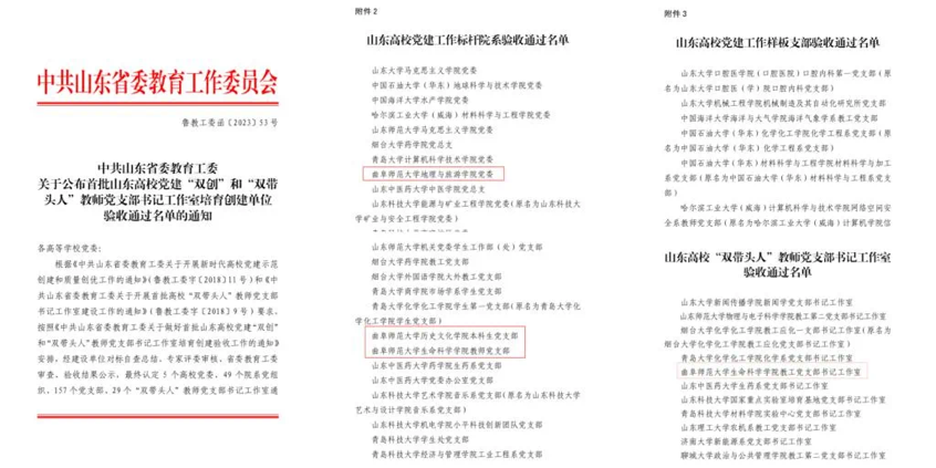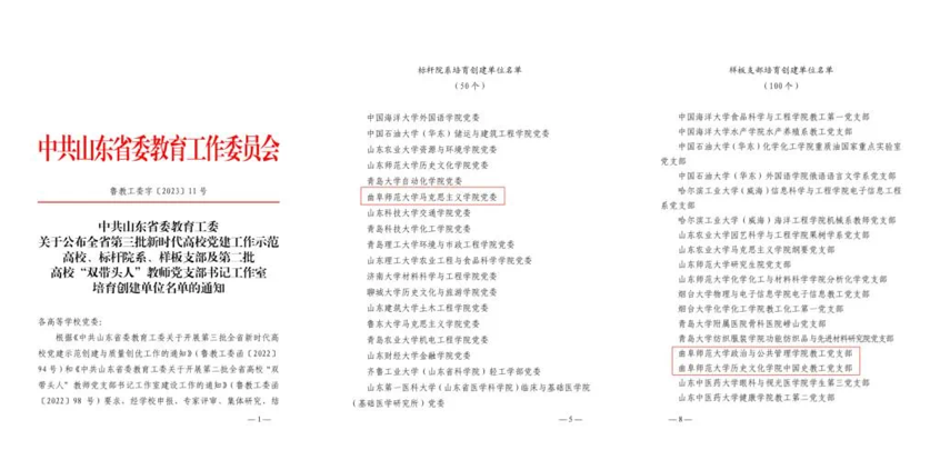 近日,山东省教育厅公布关于山东省第三批新时代高校党建工作示范高校、标杆院系、样板支部及第二批高校“双带头人”教师党支部书记工作室培育创建单位和首批山东高校党建“双创”和“双带头人”教师党支部书记工作室的验收通过名单,共确定5个示范高校、50个标杆院系、100个样板支部和50个第二批“双带头人”教师党支部书记工作室,以及5个高校党委、49个院系党组织、157个党支部、29个“双带头人”教师党支部书记工作室。成人短视频 中国史教工党支部获评山东省第三批新时代高校党建工作样板支部,成人短视频 本科生党支部通过山东省首批高校党建“双创”和“双带头人”教师党支部书记工作室验收。