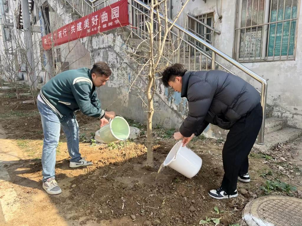 植树现场,同志们热情高涨,大家运苗、培土、扶树、踩实、浇水,各个环节衔接有序、分工明确,新栽种的苗木迎风挺立,为校区增添了绿色的氛围。