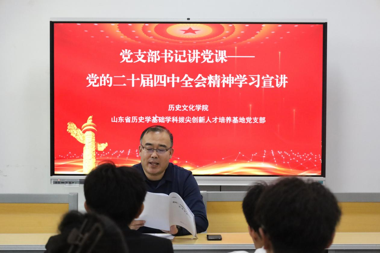 11月28日下午,成人短视频 山东省历史学基础学科拔尖创新人才培养基地党支部在孔子书院B106教室开展学习贯彻党的二十届四中全会精神宣讲暨十一月主题党日活动,党支部书记王建阳为党支部全体党员开展精神宣讲,党支部副书记闫浩主持。
