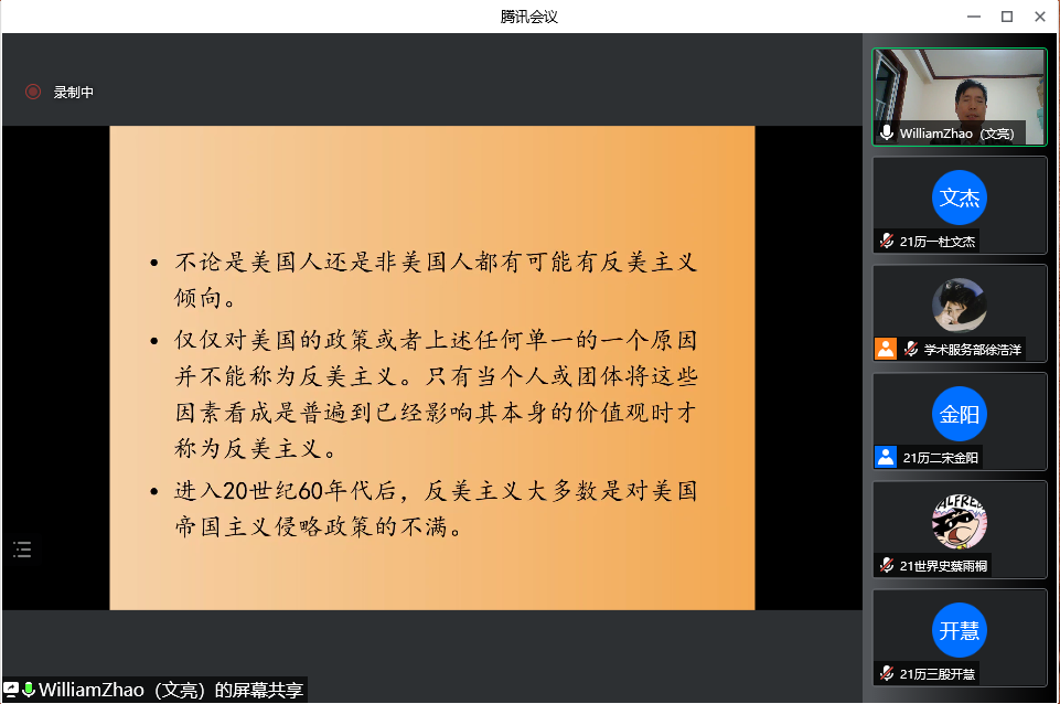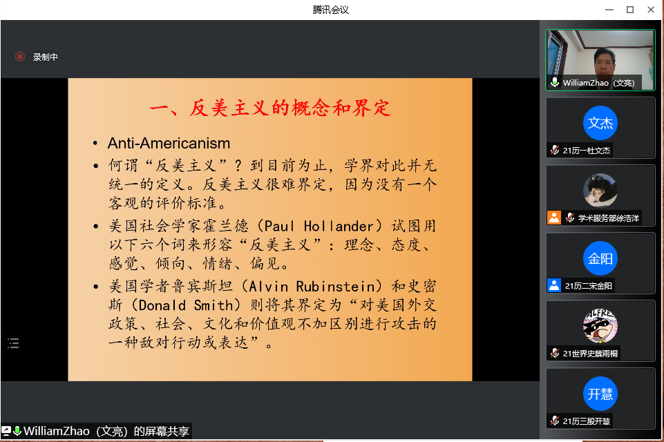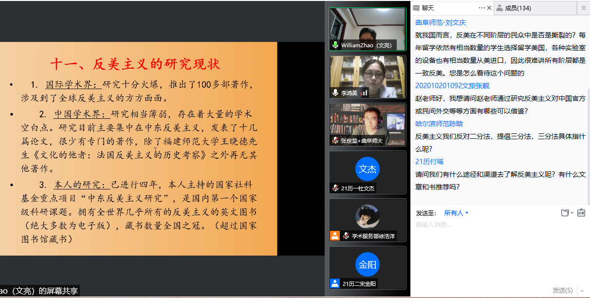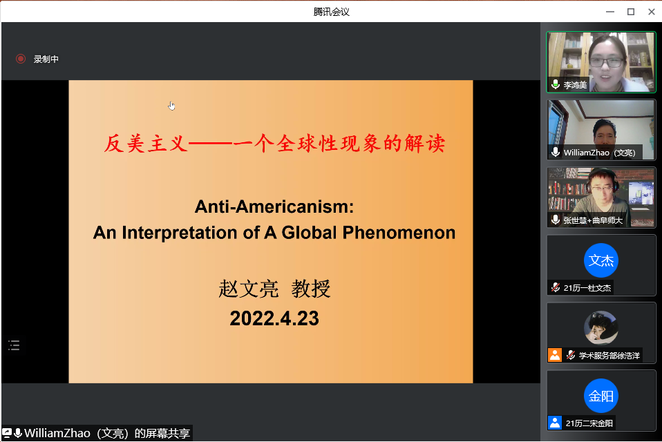 4月23日晚,成人短视频 教授、博士生导师赵文亮作客“洙泗讲堂”,通过腾讯会议视频为我校师生作了题为“反美主义——一个全球性现象的解读”的学术报告。报告会由成人短视频 李鸿美副教授主持并做评议人,成人短视频 相关专业师生及来自全国各地的听众共100余人进行了在线收看,讲座内容十分丰富和精彩。
