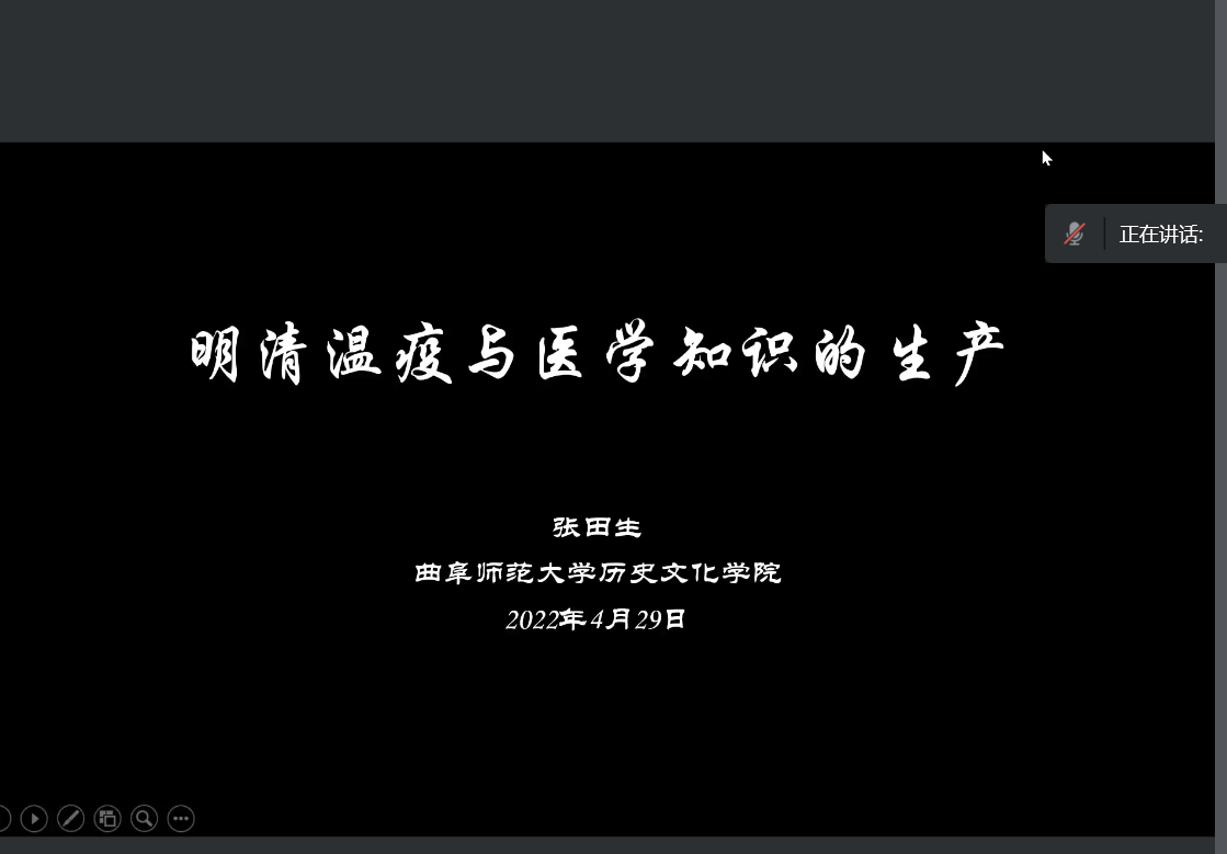 4月29日,中国社会史学会医疗社会史专业委员会理事、成人短视频 副教授、硕士生导师张田生做客“洙泗讲堂”,通过线上会议的方式为成人短视频 师生作了题为“明清温疫与医学知识的生产”的学术报告。本次会议由浙江大学历史学院特聘副研究员姬凌辉主持,成人短视频 副教授张世慧出席会议。