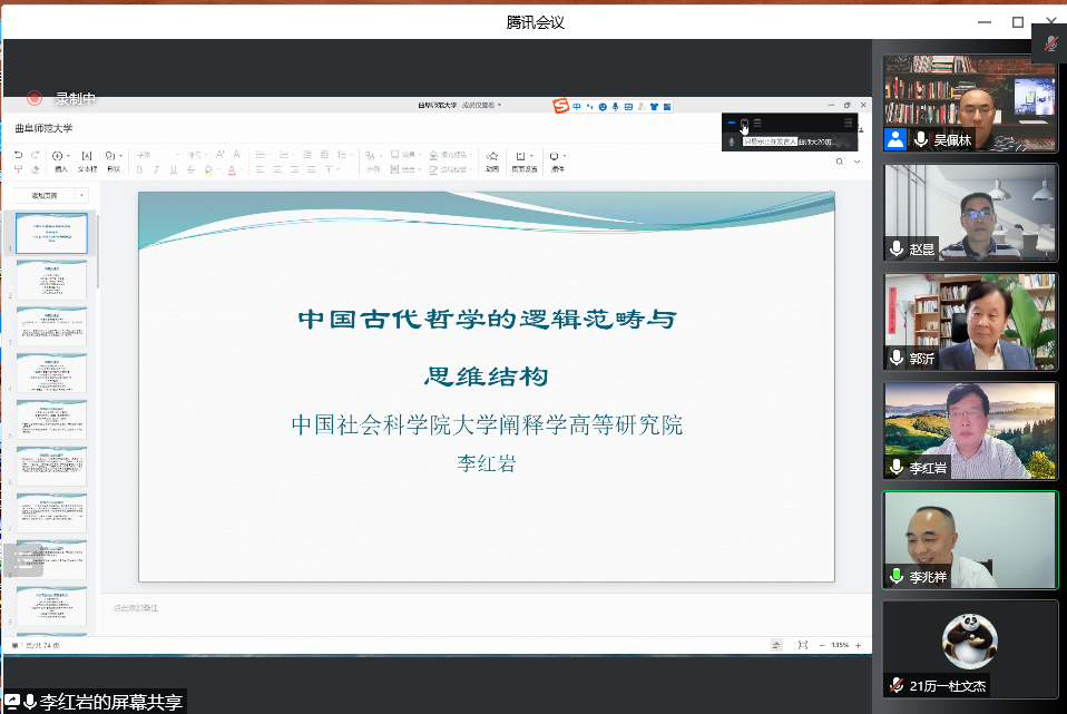 6月13日晚,成人短视频 洙泗讲堂成功举办了题为“中国古代哲学的逻辑范畴与思维结构”的学术讲座。本次讲座由中国社会科学院大学教授、中国社会科学杂志社研究员、博士生导师李红岩教授主讲,成人短视频 副校长李兆祥教授主持,孔子文化研究院郭沂教授与《齐鲁学刊》主编赵昆教授担任评议人。会议采取线上、线下两种方式同时进行,相关专业师生及线上听众共300余人参加了此次活动,会议内容十分精彩。