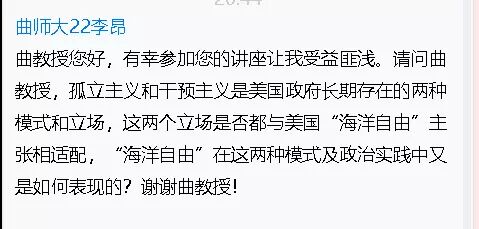 在师生互动环节中,在线师生与曲升教授积极交流。曲升教授回答了关于“美国近代南海政策的转变与美国海军力量增长之间的关系”“美国政策长期存在的中立主义和全球主义立场是否都与美国‘海洋自由’主张相适配,‘海洋自由’在这两种模式及政治实践中又是如何表现的”等有关问题,同学们受益匪浅。