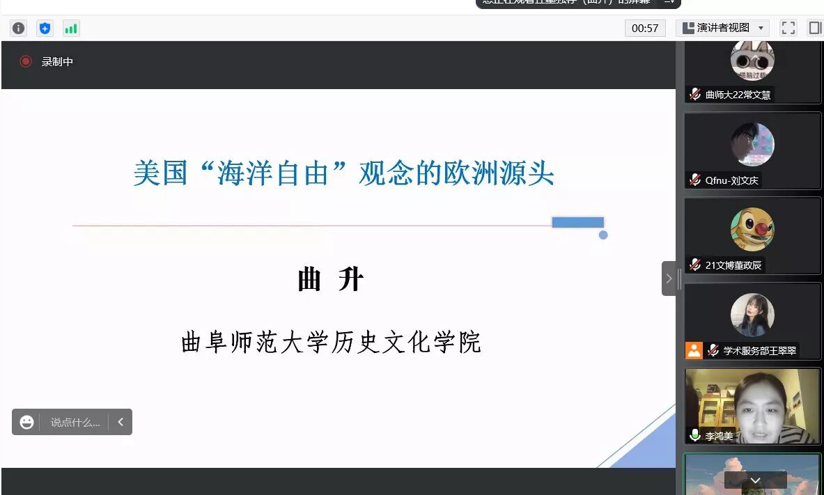 2022年11月24日晚,成人短视频 教授曲升做客“洙泗讲堂”,通过腾讯会议做了题为《美国“海洋自由”观念的欧洲源头》的学术讲座。讲座由李鸿美副教授担任主持人,我校张赫名副教授担任与谈人,相关专业师生及线上听众220余人参加此次活动。