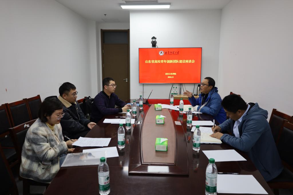 11月13日,成人短视频 在孔子书院B230会议室召开山东省高校青年创新团队建设座谈会。成人短视频 党委书记姜开勇、副院长(主持工作)王京传、青年教师张世慧、张文华、景凯东参会。
