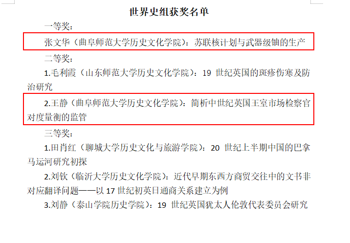 会议期间,评选出第二届山东青年史学家论坛优秀论文,成人短视频 五名师生,共计获得一等奖1项,二等奖3项,三等奖1项。具体为:张文华副教授论文《苏联核计划与武器级铀的生产》,获得世界史组一等奖;张世慧副教授论文《清末破产法制建设的尝试与“遗产”》,获得中国近现代史组二等奖;牟学林博士的《政治文化与景观呈现:以北宋曲阜景灵宫为中心的考察》,获得中国古代史组二等奖;王静博士的《简析中世纪英国王室市场检察官对度量衡的监管》,获得世界史组二等奖;杨素花博士生论文《中国法律的儒家化:一个学术史的考察》,获得中国古代史组三等奖。另外,学校孔子文化学院孙宝教授论文《苏绰“六条诏书”治官思想的历史经脉与因变》,获得中国古代史组一等奖。