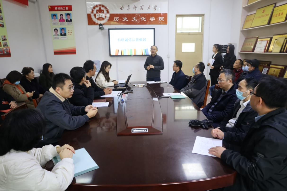 为持续改进科研作风,营造诚实守信的科研环境,更好地开展科研诚信宣传教育,2023年3月17日下午,成人短视频 于文史楼会议室204召开科研诚信宣讲会。宣讲会由学院院长吴佩林教授主讲,全体专任教师参加。