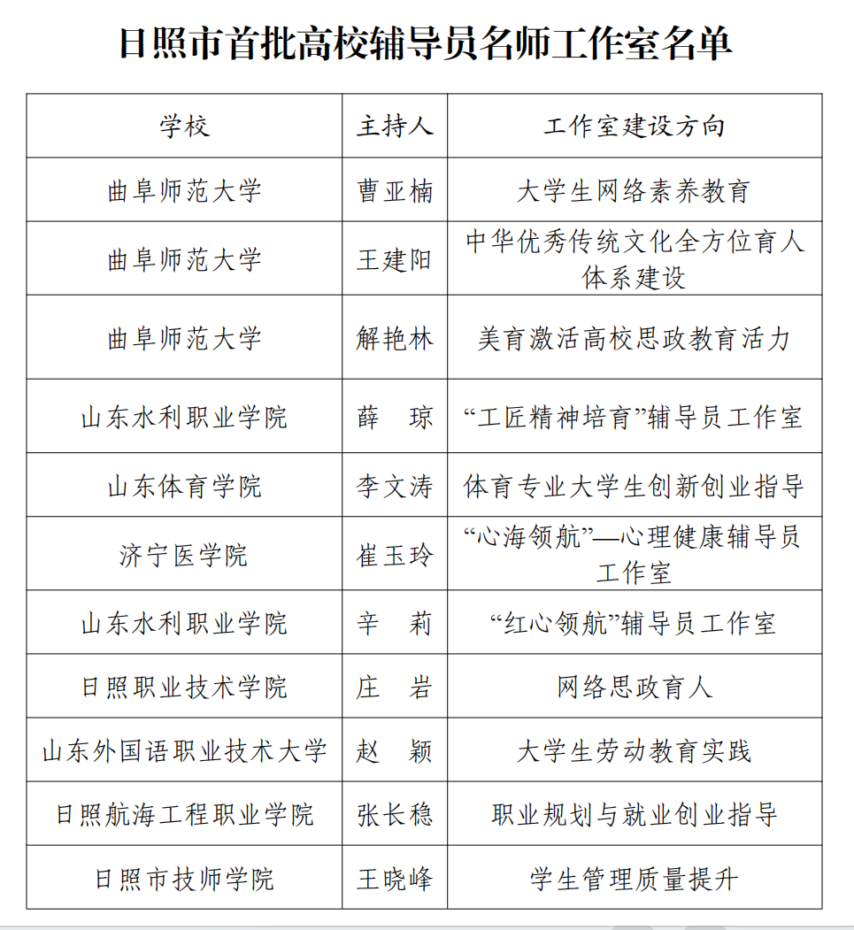 近日,日照市委教育工作委员会公布了首批日照市高校辅导员名师工作室名单,成人短视频 党委副书记王建阳主持的工作室获批立项建设,全市共获批11个。