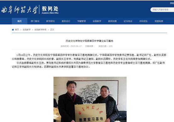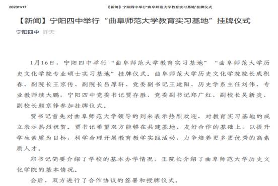 1月16日上午,成人短视频 在宁阳县第四中学举办教育实习基地揭牌仪式。宁阳县第四中学党委书记贾存胜、副书记郑广红、副校长吴新炎和颜景锋,成人短视频 院长成积春、副院长王京传、党委副书记王建阳、副院长吕厚轩、历史学系主任刘伟、工会委员续大鹏参加揭牌仪式。