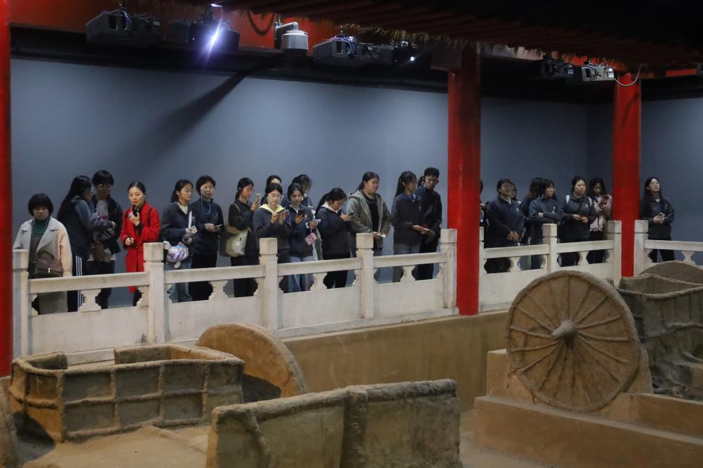 除了甲骨文,车马坑的墓葬仪制也是商文化的重要组成部分。在车马坑展厅,研学导师结合实地遗迹和仿造模型,详细介绍了商代车马形制与人物身份地位的关联性。并通过车马坑墓葬中的陪葬品,揭示了商代社会的阶级、等级关系、亲族制度、埋葬习俗及工艺水平,使学生们对商代时期的交通、军事和礼仪文化有了更深入的了解。