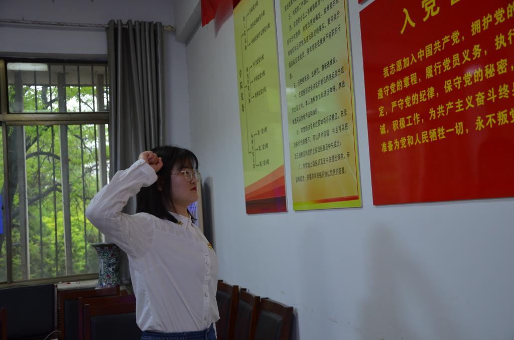 会议在雄壮的《国际歌》中拉开帷幕。研究生党支部组织委员时红凯同志宣布预备党员名单。在领誓人高舟洋同志的带领下,新发展的党员蒲凤莲、邓俊雨、刘勇江、刘宏迪面对党旗,庄严宣誓,立誓遵守党的章程,为共产主义奋斗终身。预备党员代表蒲凤莲同志作表态发言。研究生党支部书记孙锋同志在对新发展党员表示祝贺的同时,也提出全体党员应不忘入党誓词,坚持初心,积极工作,在自己的岗位上发挥模范带头作用,以优异的成绩迎接建党一百周年。
