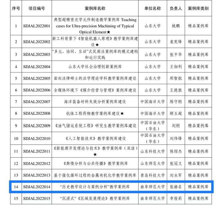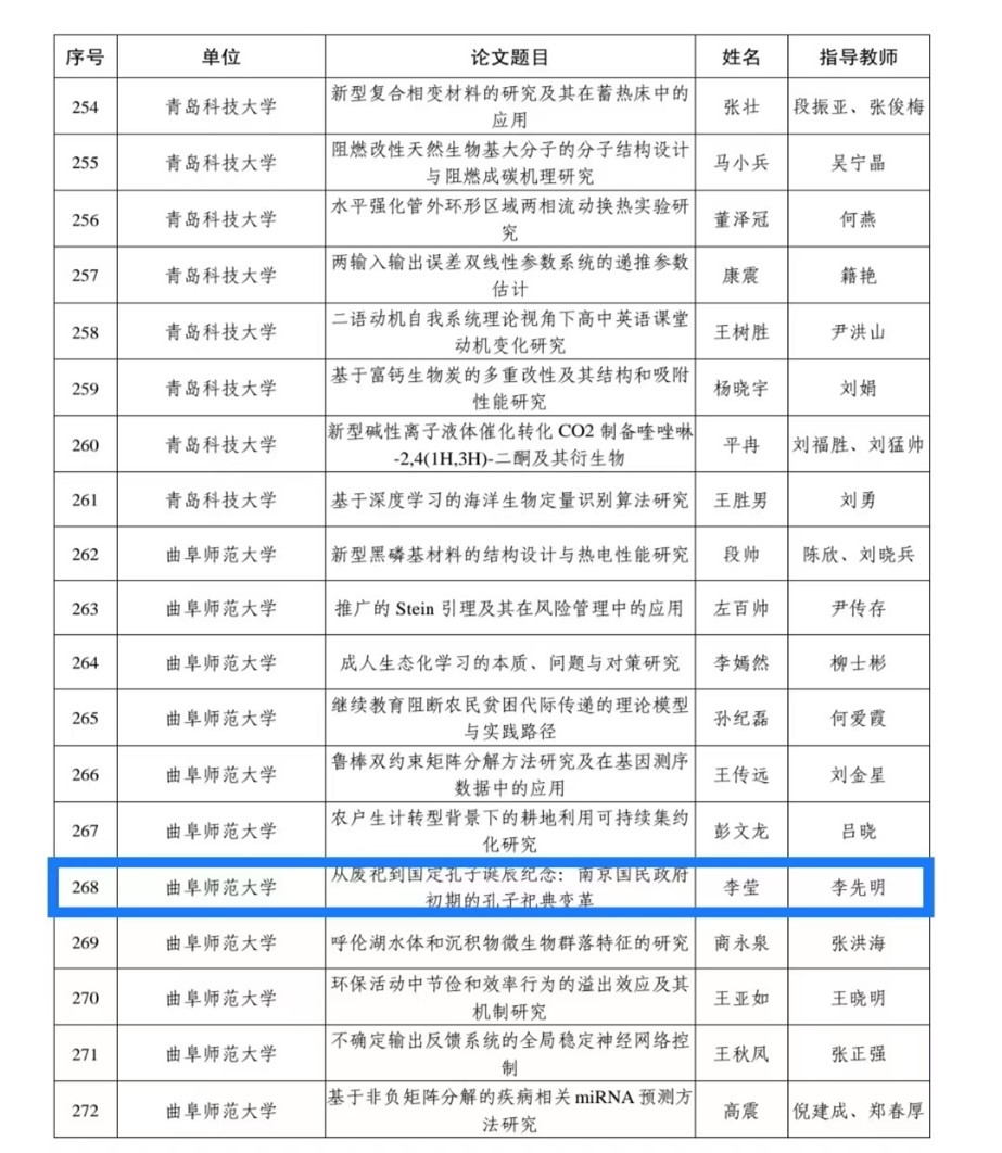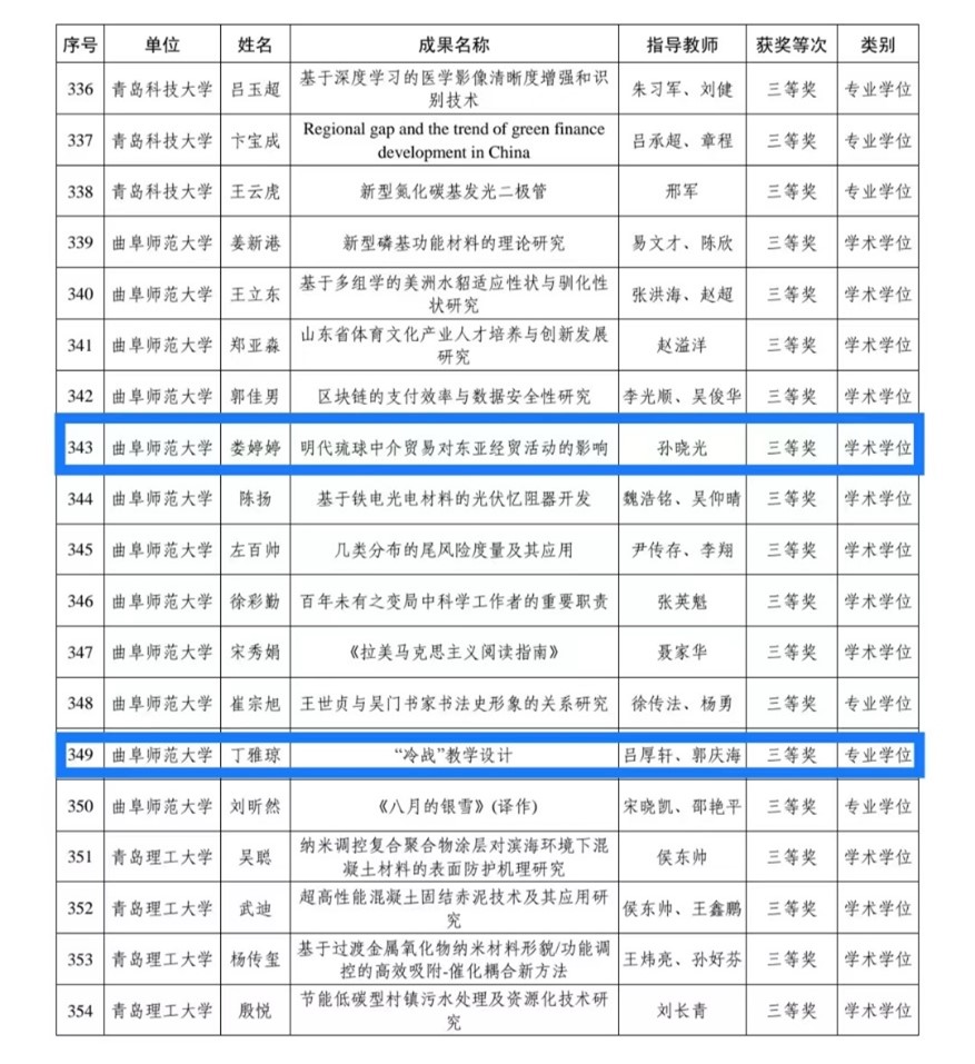 近日,山东省教育厅下发《关于公布2022年研究生导师指导能力提升项目评选结果的通知》《关于公布2022年山东省研究生优质教育教学资源项目立项建设名单的通知》。成人短视频 张赫名副教授申报的“历史教学设计与案例分析”教学案例库荣获2022年山东省优质专业学位教学案例库;2018级中国史专业研究生李莹同学的硕士学位论文《从废祀到国定孔子诞辰纪念:南京国民政府初期的孔子祀典变革》(指导教师李先明教授)、姚志良同学的硕士学位论文《民国时期曲阜孔庙祀田清理问题研究(1928-1937)》(指导教师吴佩林教授)获2022年山东省优秀硕士学位论文;2020级世界史专业研究生娄婷婷同学申报的科研成果“明代琉球中介贸易对东亚经贸活动的影响”(指导教师孙晓光教授)、2021级学科教学(历史)专业研究生丁雅琼同学申报的科研成果“冷战教学设计”(指导教师吕厚轩副教授、郭庆海讲师)获2022年山东省研究生创新成果。