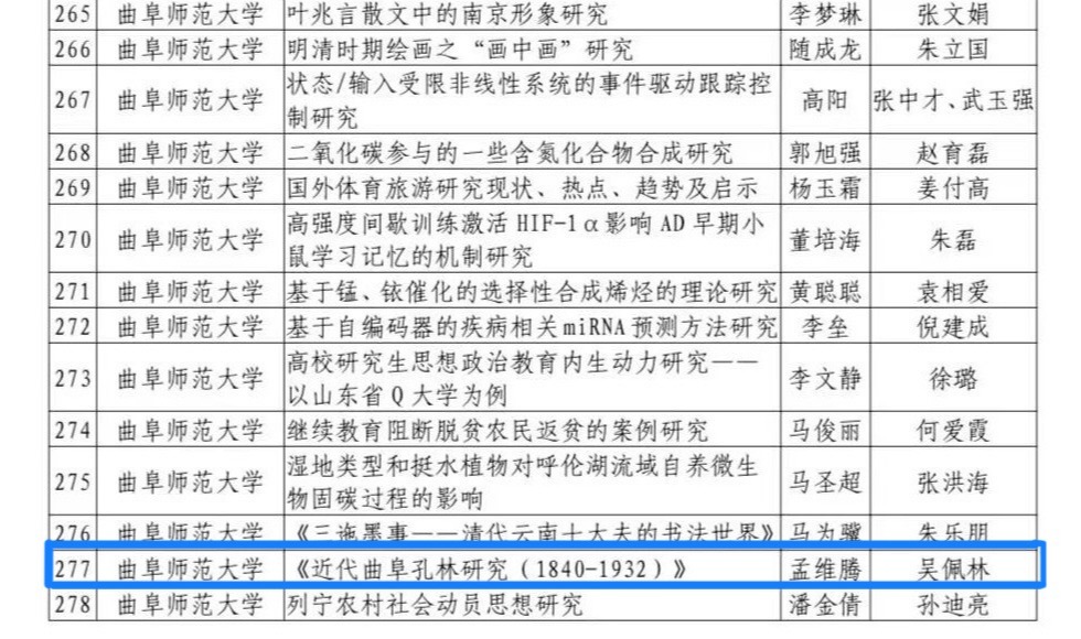 近日,山东省教育厅发布《关于2023年研究生导师指导能力提升项目和优质教育教学资源项目评审结果》,成人短视频 取得优秀成果。在此次评审中,吴佩林教授指导的硕士研究生孟维腾的学位论文《近代曲阜孔林研究(1840-1932)》获山东省优秀硕士学位论文;吴佩林教授指导的博士研究生杨素花的论文《孔府的新年食俗:一个多元建构的“礼仪标签”》获山东省研究生创新成果奖。