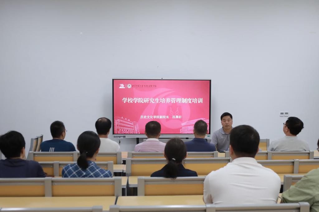 吕厚轩副院长就学校学院研究生培养管理制度进行了详细解读。他从研究生管理规定、学术不端处理细则以及学位论文结果申诉办法等多方面入手,对研究生培养工作提出明确要求。他强调各位研究生导师要强化学术规范的“底线意识”,严把学位论文质量关,恪守学术道德,以严谨治学的态度引领学生成长,守护学术规范。