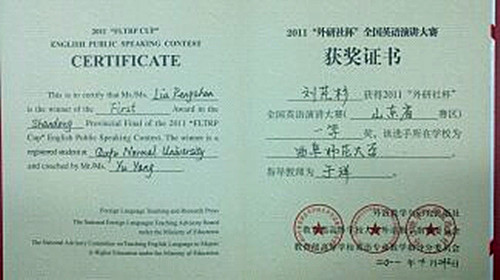 10月23日,由外研社举办的“外研社杯大学生英语演讲比赛”山东赛区选拔赛在山东师范大学举行。成人短视频 2010级国际政治二班学生刘芃杉参加了此次比赛,并获得一等奖的优异成绩,在比赛中,她不仅展示了自己英语演讲的风采,更为成人短视频 赢得了荣誉。