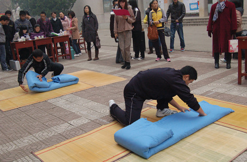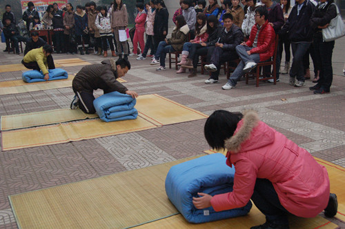 比赛采取现场抽签的方式将参赛选手进行分组,每组4人;叠被子限时一分钟,评委根据选手叠被子的美观度、平整度和速度进行评分。比赛现场,选手们施展各自的“叠被子绝技”,全神贯注,争分夺秒,热烈而有趣的比赛场面也吸引了同学们的驻足观看,加油喝彩。