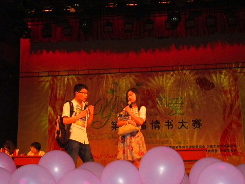 6月5日晚,由校团委、成人短视频 团总支联合主办,校社团联合会、史苑学社、成人短视频 团总支院刊管理部共同承办的第二届情书大赛在大学生活动中心礼堂圆满落幕。文学院刘永老师,成人短视频 韩锋、李春玲老师,大学生通讯社社长郭学照、成人短视频 2010届团总支副书记刘芊、院刊管理部部长连涛,史苑学社社长任国宾应邀担任本次情书大赛评委,此外,信德缘银饰经理刘新颖女士、艾美丽造型设计店长追月先生也出席了本次情书大赛。