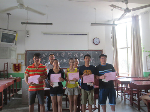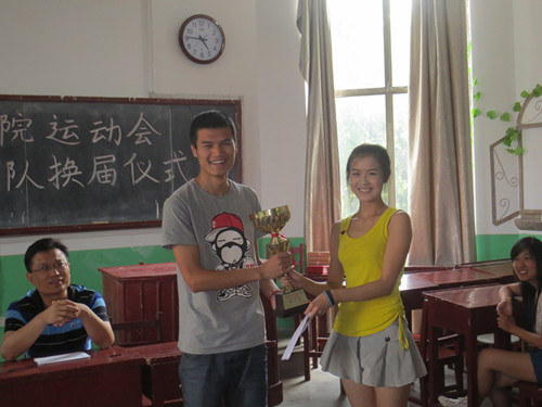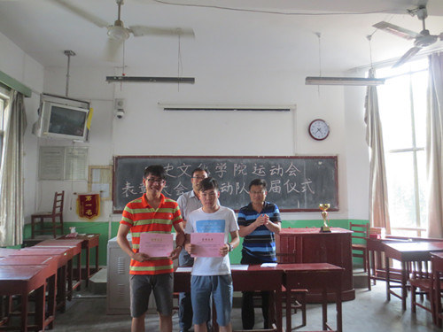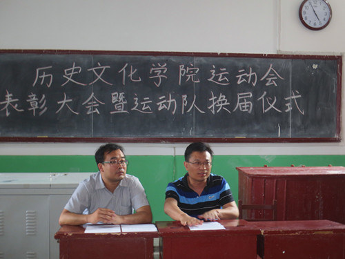 6月14日下午,成人短视频 2013年运动会表彰大会暨运动队换届仪式在文史楼309室举行,出席本次大会的有成人短视频 党总支副书记王慕东、团总支书记王建阳,以及2013年运动会的教练员及运动员等。大会由王建阳主持。
