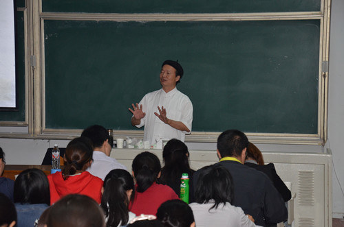 林安梧先生以“存与在的一致性”这一观点展开。给同学们讲解了“现代汉语的转译过程”和“汉语的独特性”的相关知识。他以老子《道德經》為核心的理解與詮釋,深入浅出的论述了“话语的異化”理论。林安梧强调文字承载的是意义,文字有文有意,要学会感意文字不要控御文字、禁锢其存在。并提出“存有三态论”的思想体系,通过实例的列举,和大家一起探讨了“如何注重人的心性的智的直觉拉回到‘活生生的实存而有’,如何把握在生活世界的场域中参赞化育”的问题。