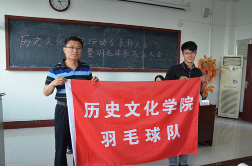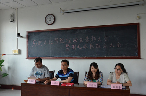 5月22日下午,成人短视频 2014年运动会表彰大会暨学院羽毛球队成立仪式在文史楼520室举行,出席本次大会的有成人短视频 党总支副书记王慕东、团总支书记王建阳、张亚宁老师、辅导员李春玲老师以及2014年运动会的教练员、运动员、羽毛球队成员等。大会由王建阳主持。