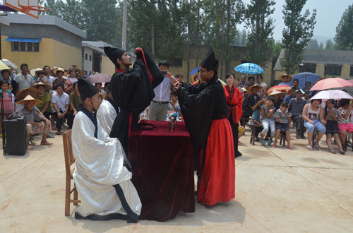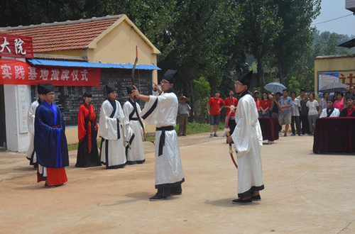 荆兆勋与泗水县委书记范宇新共同为传统文化教育实践基地揭牌。孙文亮发表讲话,向实践基地的建成表示祝贺。揭牌仪式结束后,成人短视频 “明德故事讲堂”第一讲开讲,王曰美教授为大家讲述了“颜回食墨”、“曾参耘瓜受杖”等历史典故,以历史故事的形式教育大家明礼诚信、修身立德。随后,成人短视频 同学身着汉服为领导老师和村民们进行了射礼展演,再现了儒家文化的深厚内涵与底蕴。