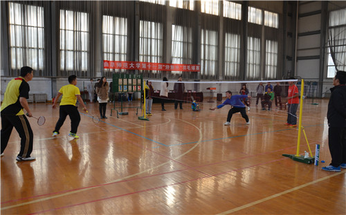 11月8日上午,由我校体育运动委员会和成人短视频 团总支主办,羽毛球协会承办的成人短视频 2014年“迎新杯”羽毛球比赛在西操场体育馆拉开帷幕。成人短视频 工会主席兼生命科学学院党总支书记王万民、校团委副书记孔轶众、体育教学部主任李大新、体育科学学院副教授张晓风、体育教学部赵哲哲、成人短视频 团总支书记王建阳、14级辅导员韩琳琳应邀出席了开幕式,开幕式由王建阳主持。