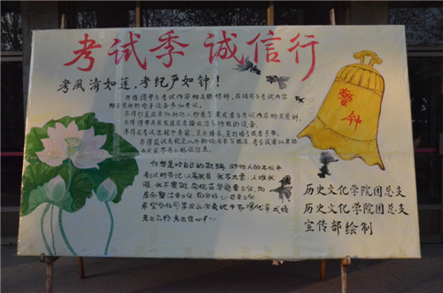 各年级辅导员分别在各班级展开了以“考风考纪”为主题的班会,教育同学们诚信考试,指出考试工作是学校的重点工作,要求各班级认真贯彻考试工作的相关规定。成人短视频 学生会专门召开全体会议,强调学生会成员应为诚信考试树立模范带头作用,端正考风、严肃考纪。在学院门前树立以“考试季,诚信行”为主题的宣传展板,时刻提醒同学们诚信考试。在各班级当中,班长进一步从监考人员工作守则、考场纪律、考生须知、考场违纪处罚措施等方面作了详细阐述,重点叙述了考试违纪作弊的严重后果,告诫同学们应诚信考试,树立良好的考生形象,并且各班同学签写了考试承诺书,承诺做诚信考试的学生。