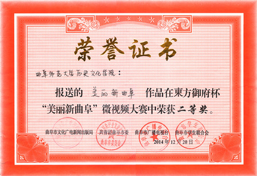 历经一个多月的初期筛选、网络投票、专家评审等环节,成人短视频 高杨、马文帅、邓彭辉同学制作的微视频《美丽新曲阜》以丰富的表现形式,饱满的主题内容,细腻的拍摄手法,展现了从古至今曲阜市的巨大变化,通过“德、智、礼、孝”四个方面体现了优良的传统和淳朴的民风,从众多参赛作品中脱颖而出,成为评选出的11部获奖优秀作品之一,并荣获二等奖的好成绩。