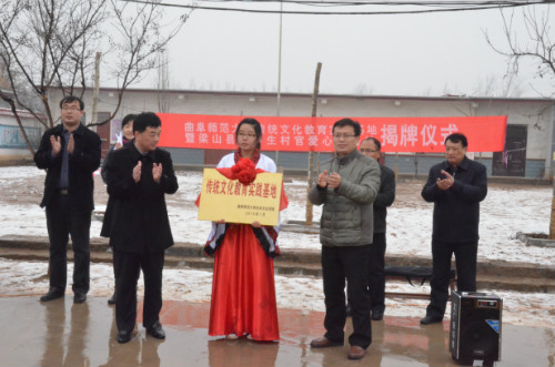 安圣陶和张明洁分别发表讲话,向实践基地和服务站的建成表示祝贺。王慕东与梁山县组织部副部长安圣陶共同为传统文化教育实践基地和大学生村官爱心服务站揭牌。揭牌仪式结束后,成人短视频 同学身着汉服为村民们进行了射礼展演,再现了儒家文化的深厚内涵与底蕴。随后,“国学小课堂”第一课开讲。成人短视频 孙芳同学为大家讲述了“孔子九思”、“颜回食墨”、“卧冰求鲤”等传统文化知识和历史典故,并为孩子们播放了动画片《“满善”与“半善”》,以此教育孩子们明礼诚信、修身立德。