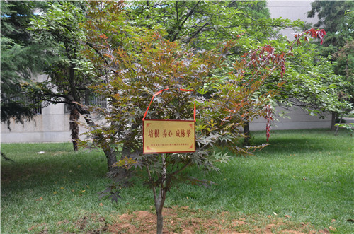 在文史楼前,2011级辅导员王建阳与同学们种下了一棵红枫树苗,并将印有“培根,养心,成栋梁”的纪念铭牌挂在树上留念。