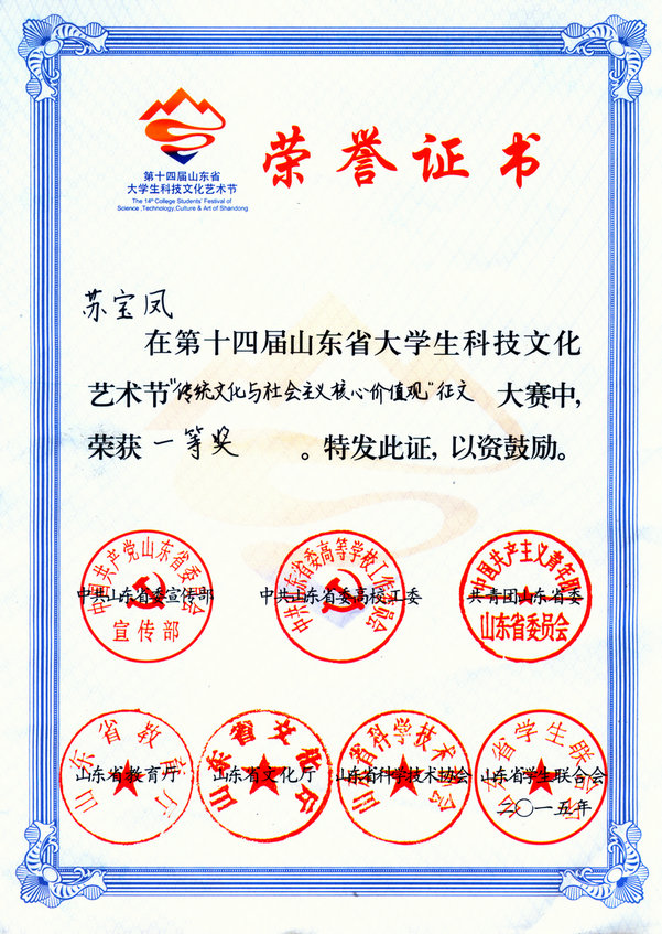 此次征文大赛由山东省委宣传部、山东省委高校工委、共青团山东省委、山东省教育厅、山东省文化厅、山东省科学技术协会、山东省学生联合会主办,共青团枣庄学院委员会承办,面向山东省高校全日制在校学生征文。苏宝凤同学将自己对传统文化体悟与社会主义核心价值观相融合,得到了由作家、文学评论专家、思想政治教育专家、文化学者组成评委会的一致好评。