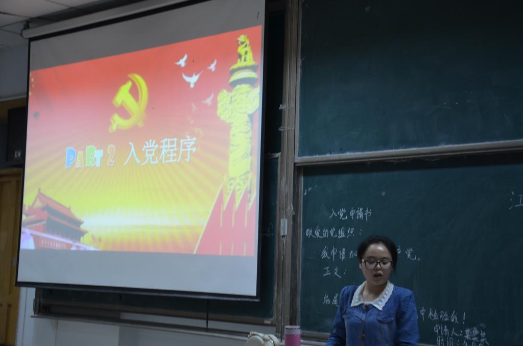 江敏巧向2015级新生详细介绍了大学生在校入党的相关知识和各项规定,对新生入党的具体流程以及如何规范书写入党申请书进行讲解。对新生提出的疑问做出了耐心解答。