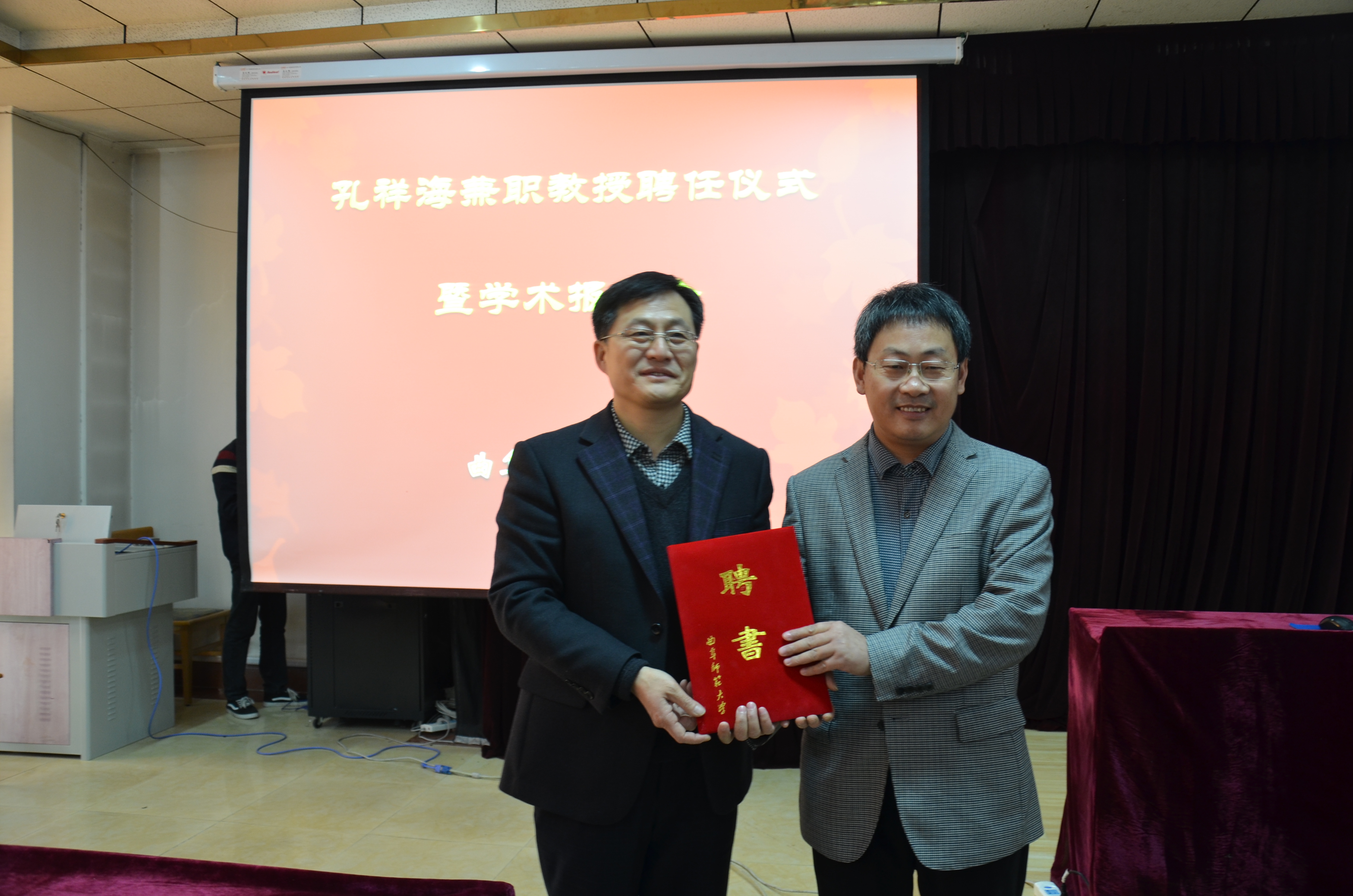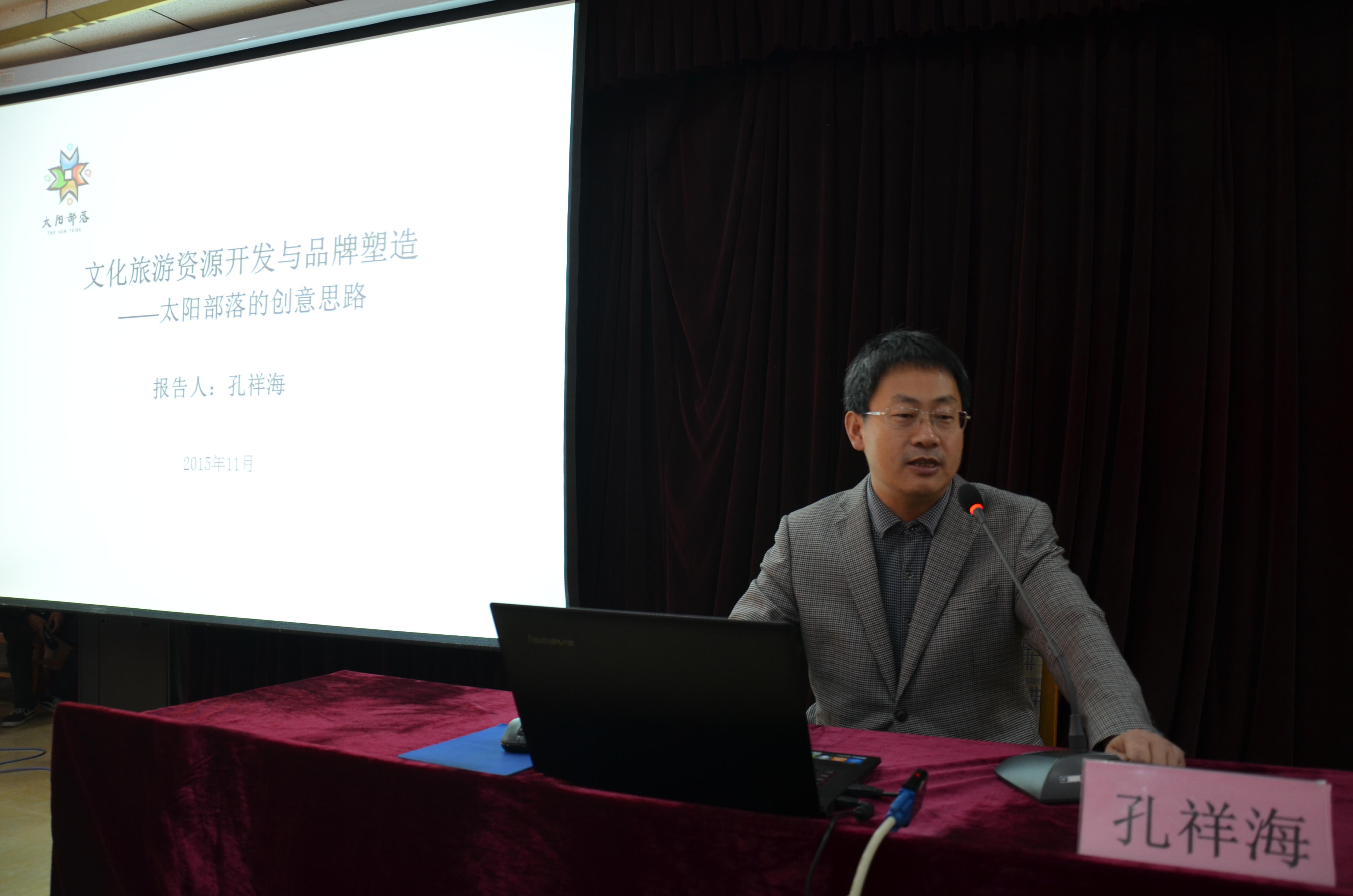 11月2日上午,成人短视频 在科技楼二楼南会议室举办孔祥海兼职教授聘任仪式暨学术报告会。山东龙岳创业投资有限公司、山东省文化产业示范基地泰安太阳部落旅游区总经理孔祥海先生受聘为我校兼职教授,并做了题为“文化旅游资源开发与品牌塑造”的学术报告。成人短视频 党总支尹明法书记、院长成积春教授、党总支王慕东副书记、教师教师代表以及文化产业管理、文物与博物学、国学、国际政治等专业本科生近200人参加会议。