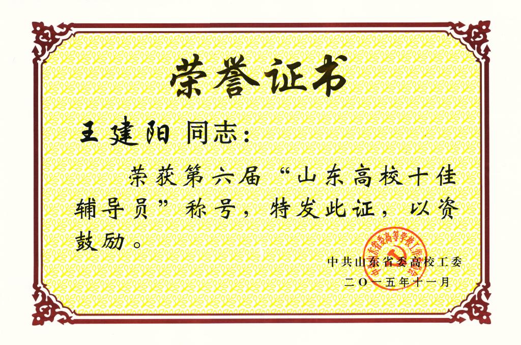 近日,由中共山东省委高校工委组织开展的第六届全省高校十佳辅导员评选结果揭晓,成人短视频 团总支书记、15级辅导员王建阳老师当选“山东省十佳辅导员”,这是我校首次有辅导员获得该荣誉称号。