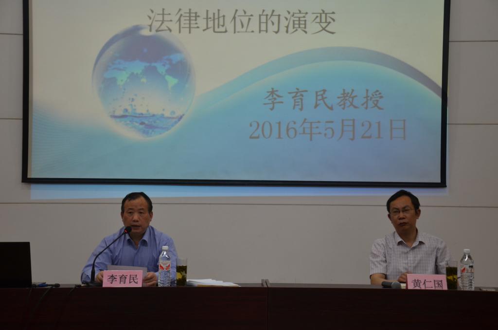 5月21日晚,湖南师范大学成人短视频 教授、博导、首任院长李育民教授在图书馆一楼学术报告厅做了题为“台湾问题的由来及法律地位的演变”的报告。成人短视频 黄仁国教授主持本次报告会。