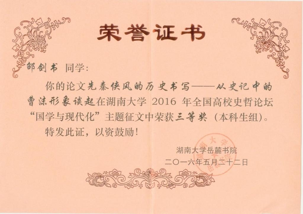 近日,成人短视频 2013级国学班邵剑书同学在湖南大学2016年全国高校史哲论坛“国学与现代化”主题征文大赛中,凭借论文“先秦侠风的历史书写——从史记中的曹沫形象谈起”获得本科生组三等奖的优异成绩,并且获得了参加本年度“全国高校国学论坛闭幕式暨征文颁奖典礼”的资格。