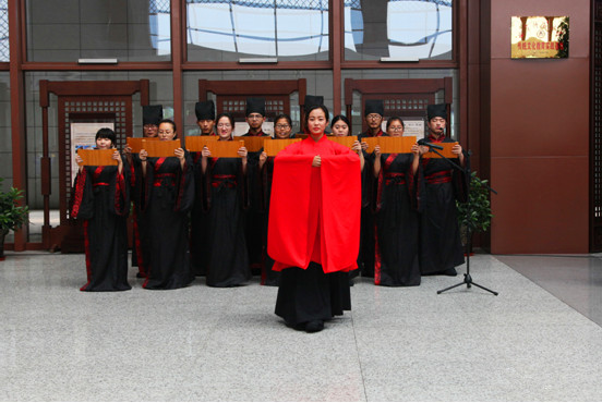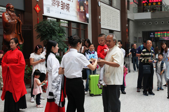 6月8日上午,端午佳节之际,京沪高铁曲阜东站候车大厅内,成人短视频 传统礼仪展演队身着儒服吟诵《离骚》、表演汉舞“礼仪之邦”、演绎汉礼,与候车旅客进行《论语》接龙互动,为旅客献上了多道端午节文化大餐。中国青年网、新华网、人民网、大众日报、山东广播电视台、中国山东网等十几家媒体记者对活动进行了报道。 本次展演在传统佳节之际让更多人了解中华传统文化,弘扬儒家精神。