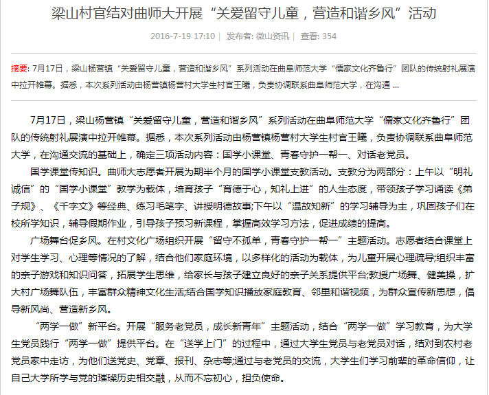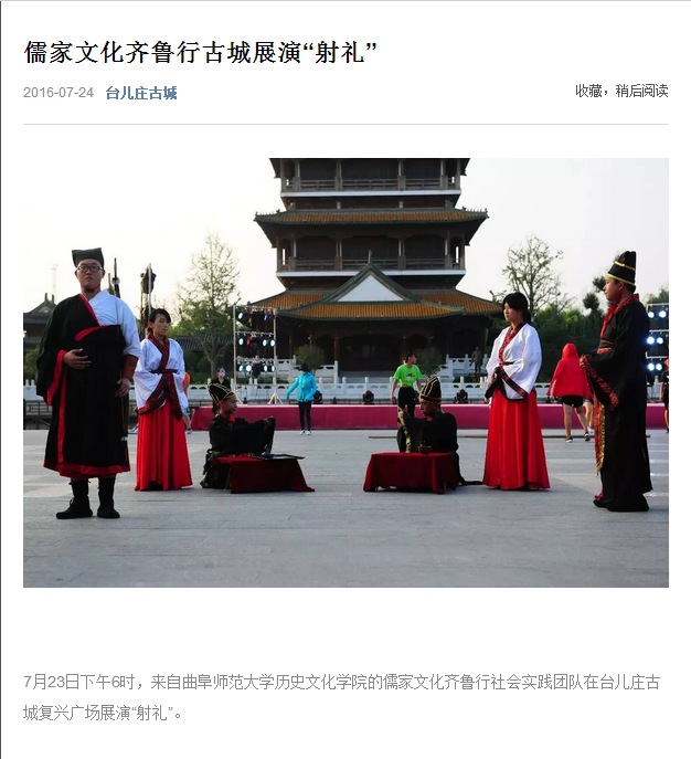在我校2016年大学生暑期“三下乡”社会实践活动中,成人短视频 的“儒家文化齐鲁行”社会实践活动和“儒家文化”进社区活动引起了校内外媒体的广泛关注。中国高校之窗等多家媒体对成人短视频 “儒家文化齐鲁行”社会实践活动的开展以及实践团队的情况进行了相关报道,并给予了高度评价。