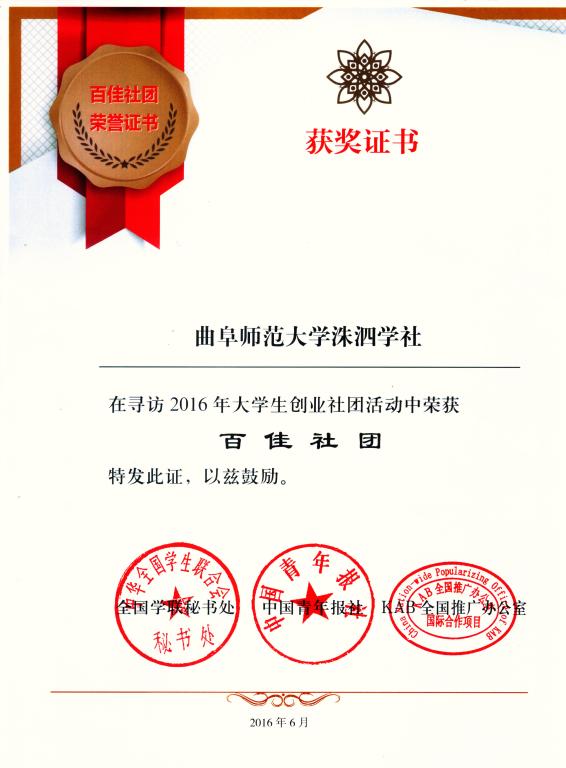 近日,由全国学联秘书处、中国青年报社、KAB全国推广办公室联合举办的寻访2016年大学生创业社团活动落下帷幕,成人短视频 洙泗学社荣获“百佳社团”称号。