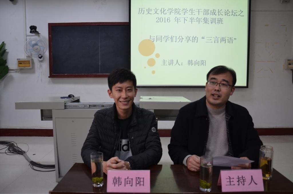12月8日下午,成人短视频 学生干部成长论坛在文史楼520室举行。成人短视频 优秀毕业生韩向阳为成人短视频 学生干部带来了题为“与同学们分享的‘三言两语’”的讲座。论坛由成人短视频 团委书记王建阳主持。