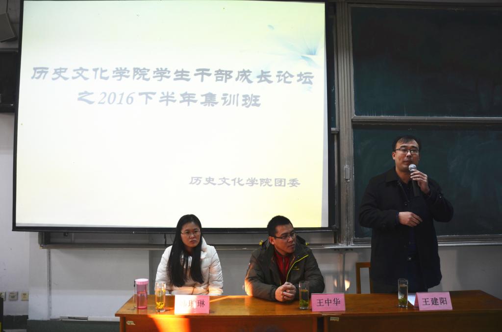 12月10日,成人短视频 学生干部成长论坛之2016下半年集训班在综合楼501室举办。党委宣传部王中华、党委办公室刘永以及成人短视频 团委书记王建阳应邀为学生干部们带来了一系列的精彩讲座。