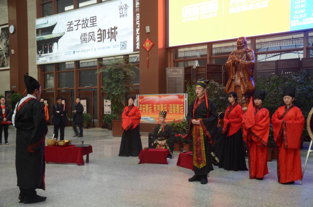 1月12日下午,成人短视频 传统礼仪展演队的学生在曲阜东站进行了古色古香的射礼表演。