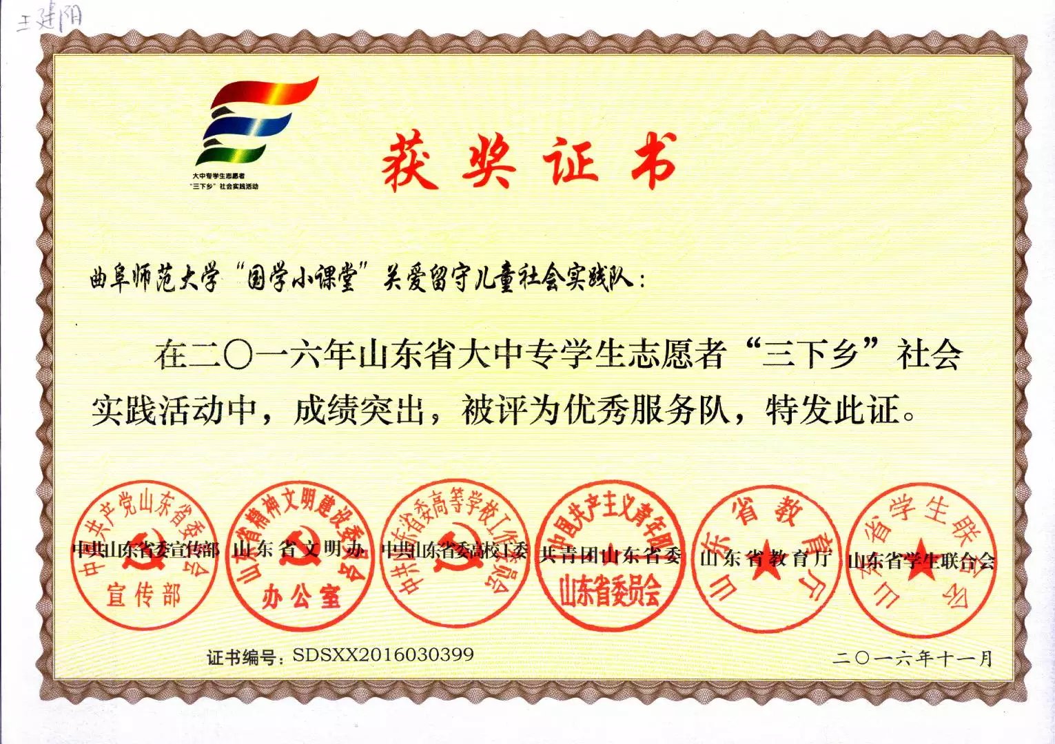 近日,2016年山东省大中专学生志愿者暑期三下乡社会实践活动落下帷幕。成人短视频 “国学小课堂”和“儒家文化齐鲁行”社会实践队双获优秀服务队和省级优秀实践团队,张俊成获优秀指导教师,刘雁成、朱晓明两位同学获优秀队员。