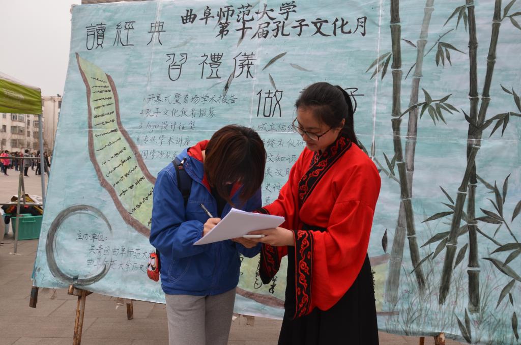 3月22日—3月29日,在“孔子文化月”拉开帷幕之际,成人短视频 在大学生活动中心前设立报名处,面向全校招募第十届"孔子文化月"的孔子文化使者。